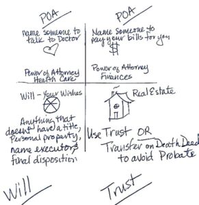 Estate planning includes four components; (1) a Will, (2) Power of Attorney for Finances, (3) Power of Attorney for Health Care, and (4) a Revocable Trust. These are the four parts of anyone’s estate plan. The authority of Powers of Attorney die with you. Everyone needs a Will because everyone has “Stuff”. If you don’t own a house, you don’t need a trust. It’s just that simple.